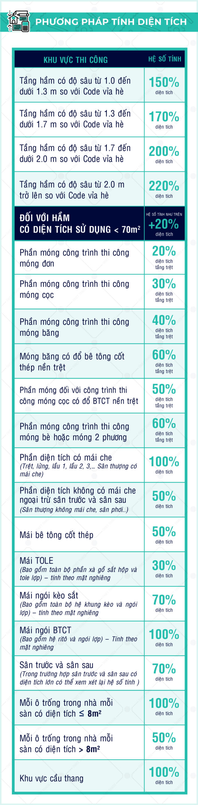 + Tổng diện tích xây dựng sẽ bao gồm tổng các diện tích từ móng đến mái: Móng – Hầm – Các Tầng – Mái – Sân Thượng.